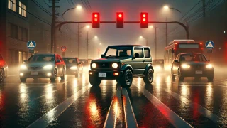 信号待ちの夜。街の明かりが濡れたアスファルトに滲んで、クルマたちのテールランプが赤い余韻を引いていく。その列の中で、ジムニーだけが少し違って見えた。小さな車体なのに、背筋が伸びている。まるで「道が終わる場所」へ行く準備が、いつでもできている...
