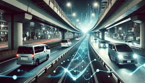夜の首都高。湾岸線の照明が、路面に薄い金属の膜をつくる。
